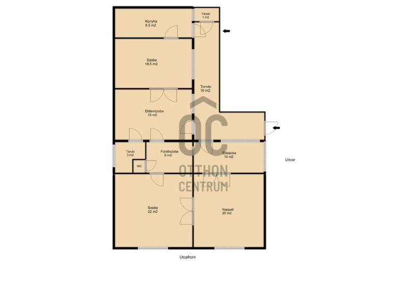 Az ingatlan lakóterülete közel 100 m², melynek egy része vegyes falazatú, míg a később hozzáépített, mintegy 60 m²-es utcafronti szakasz téglából készült.