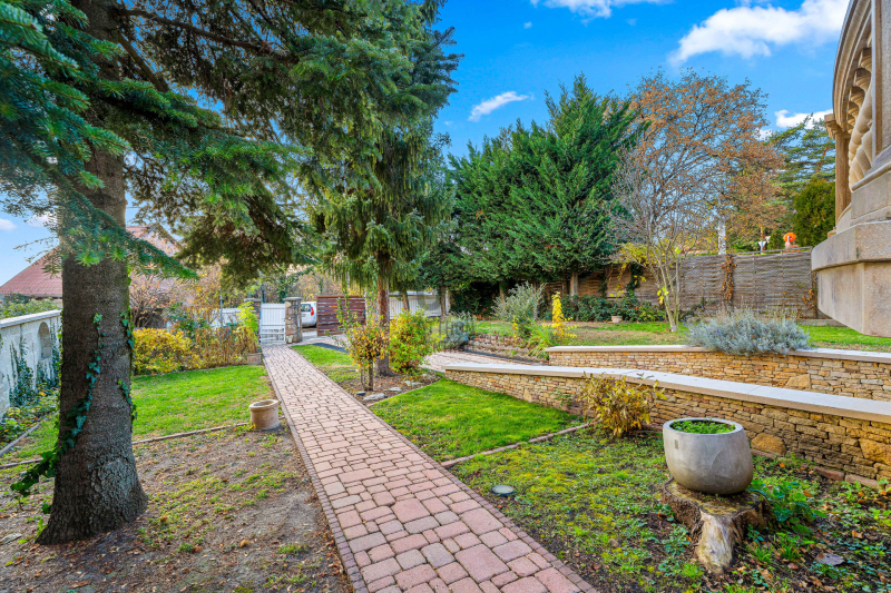 - Mediterrán hangulatú, gondozott kert oszlopsorral, természetes kőburkolattal, dísznövényekkel és örökzöldekkel