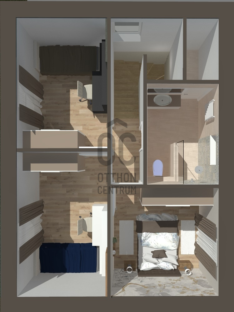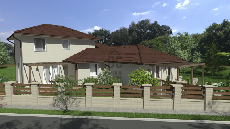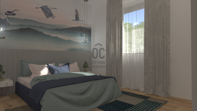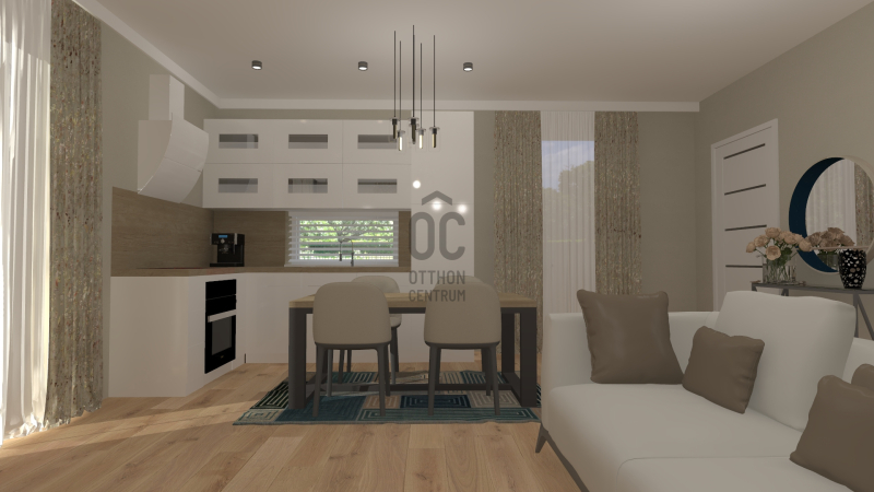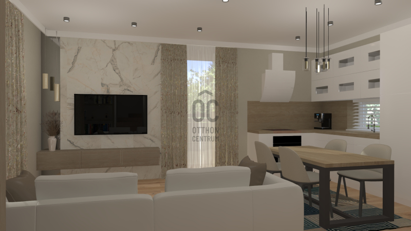 Négy hálószoba és két fürdőszoba biztosítja a család kényelmét, a nagy amerikai konyhás nappali pedig valódi központi élettér, amelyet a látványtervek is bemutatnak.