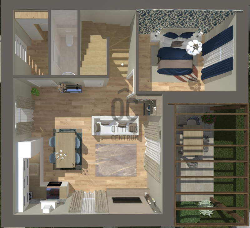 A nappaliból közvetlen kijárat nyílik a teraszra, amely a privát kerttel együtt tökéletes helyszínt ad a pihenéshez és a közös programokhoz.