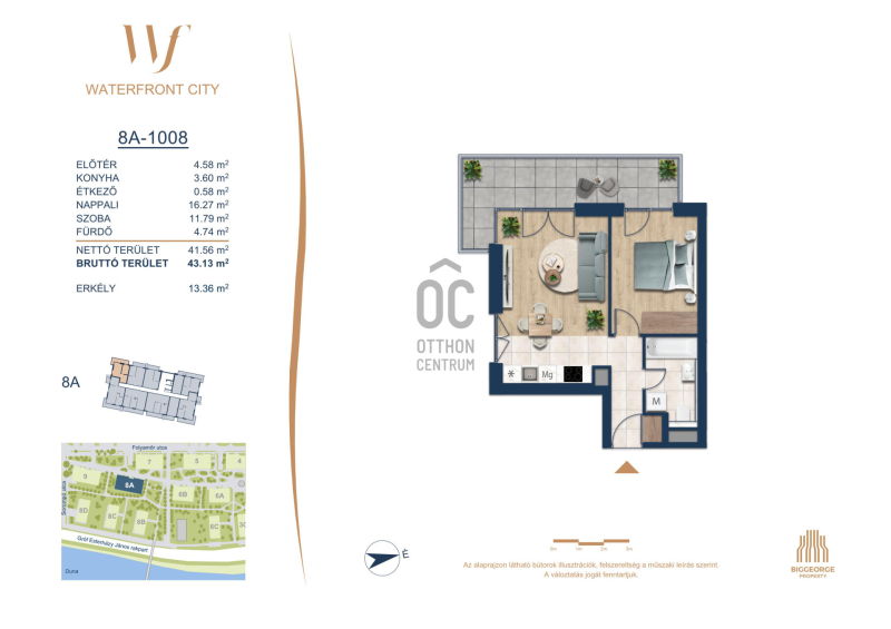 A Waterfront City egy új, modern városnegyed a 3. kerületben, ahol a természet közelsége és a városi kényelem tökéletes egyensúlyban van. A Duna-part közvetlen szomszédságában elhelyezkedő fejlesztés különleges atmoszférát kínál: a sétányt új épületek határolják, üzletekkel, kávézókkal és szolgáltatásokkal, amelyek élhető közösségi teret teremtenek.