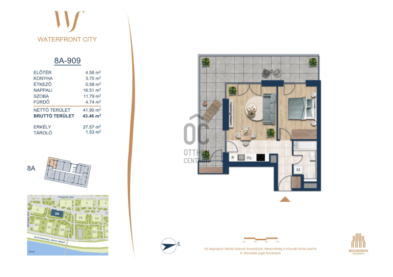 A Waterfront City egy új, modern városnegyed a 3. kerületben, ahol a természet közelsége és a városi kényelem tökéletes egyensúlyban van. A Duna-part közvetlen szomszédságában elhelyezkedő fejlesztés különleges atmoszférát kínál: a sétányt új épületek határolják, üzletekkel, kávézókkal és szolgáltatásokkal, amelyek élhető közösségi teret teremtenek.