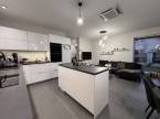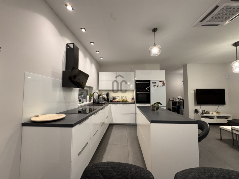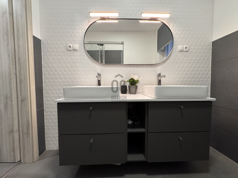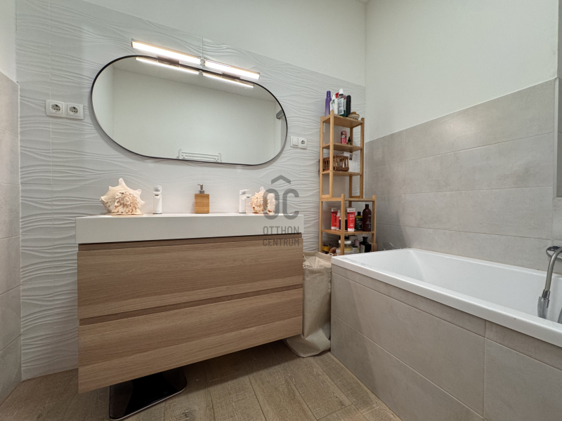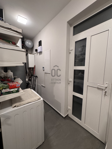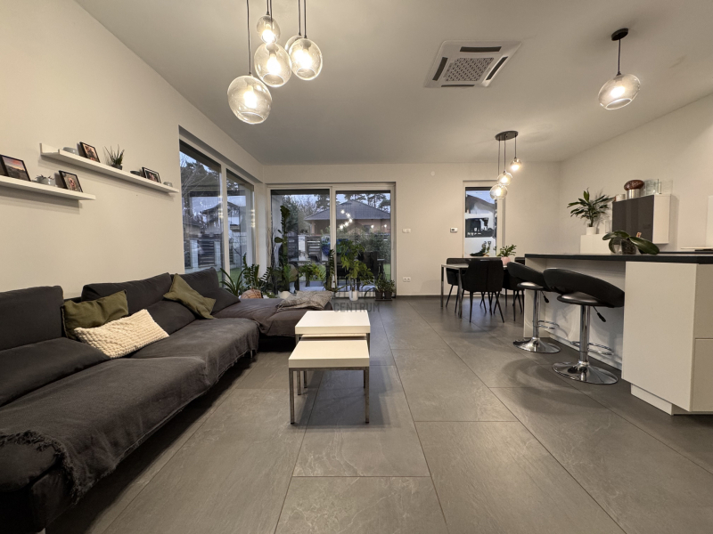 Földszinten: kényelmes előszoba, egy hálószoba, épített zuhannyal felszerelt fürdőszoba+WC, háztartásihelyiség+gépház, GARÁZS, amerikai konyhás nappali+kamra, nagy fedett terasz alkotják a helyiséglistát. Rengeteg az üvegfelület, így ennek és a kiváló tájolásnak köszönhetően napfényes, szellős és tágas terek születtek. A konyha magafényű frontos minimál stílusú, teljes gépesítéssel és bárpultos konyhaszigettel rendelkezik, nagy méretű olasz kerámia burkolólapok és magas minőségű beltéri ajtók valamint design lámpatestek emelik a hangulatot. A háztartási helyiség jól pakolható, rendkívül praktikus mosókonyhaként is funkcionálhat, a kamra polcrendszerrel felszerelt, a garázsban pedig valóban hatalmas hely jut az autó tárolásán felül a családi bicikliknek, SUP flottának, grillszettnek.