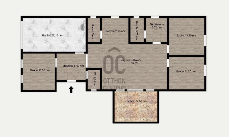 A 130 nm alapterületű lakótér kényelmesen kihasználható, tágas tereket eredményez. A közös életteret 40 nm alapterületű Amerikai konyhás-nappali-étkező biztosítja.