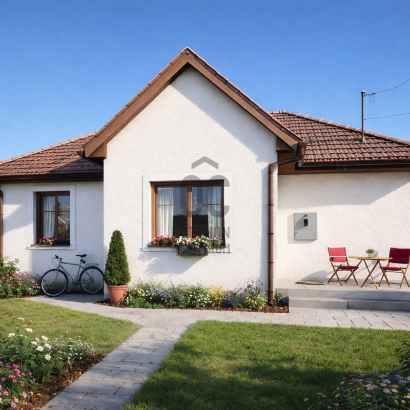-tégla építés, fa födém, cserép fedés