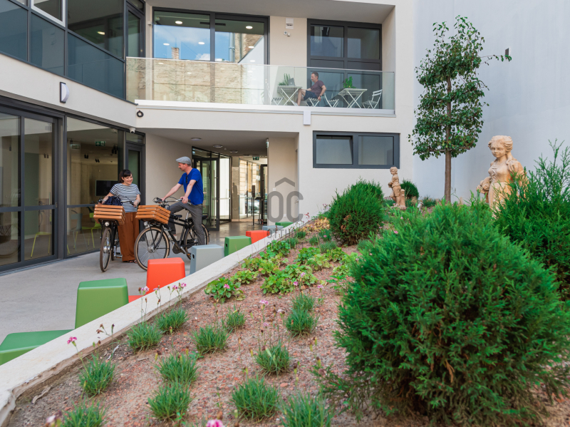 Az építészeti díjas homlokzat mögött egy 6 szintes megújuló energiaforrásokkal működő, korszerűsített ipari épület található, ahol energiahatékony üzemelés, hőszivattyú rendszer és geoáram működik.
