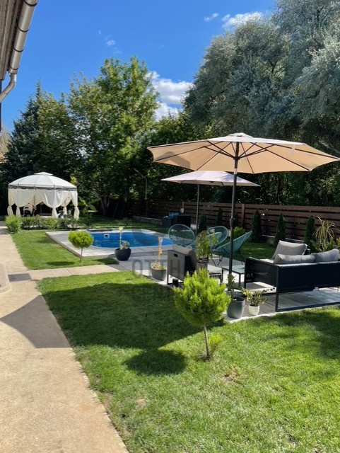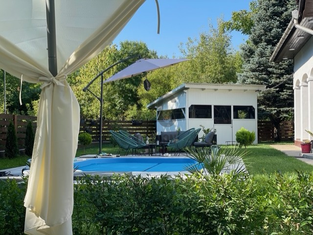 A kertben kialakított 15 m²-es medence a nyári pihenés központja, míg a 10 kW-os napelemrendszer hosszú távon gazdaságos fenntartást biztosít.