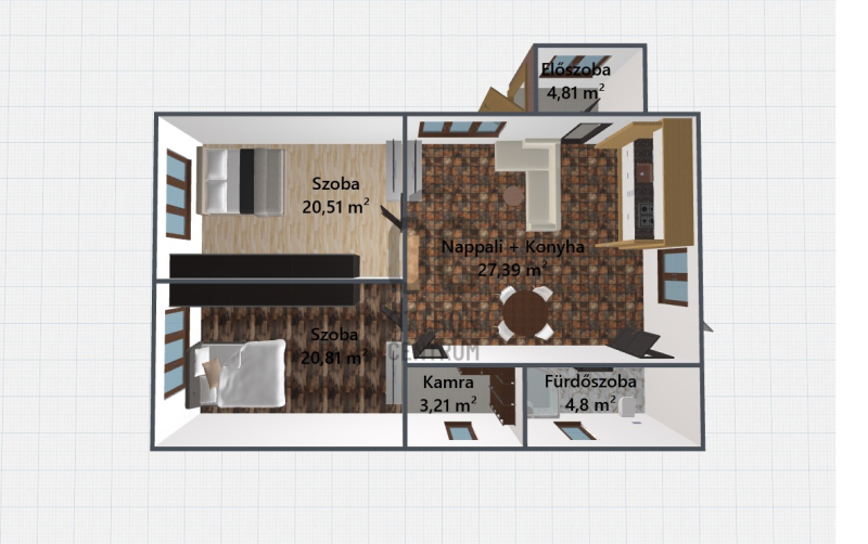 két külön nyíló szoba mellett egy nappali–konyha–étkező egybenyitott tér biztosítja a családi élet központját. Emellett fürdőszoba, előszoba és kamra is helyet kapott. A nappaliból közvetlen kijárat nyílik a 22,67 nm-es, nagy fedett teraszra, amely tökéletes helyszíne lehet pihenésnek, baráti összejöveteleknek vagy akár egész évben használható kültéri élettérnek.
