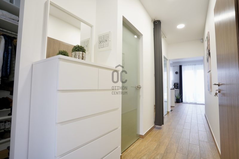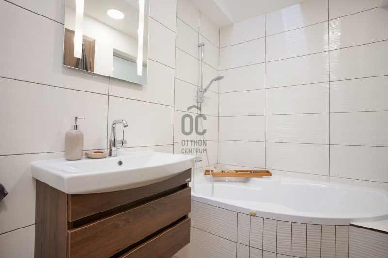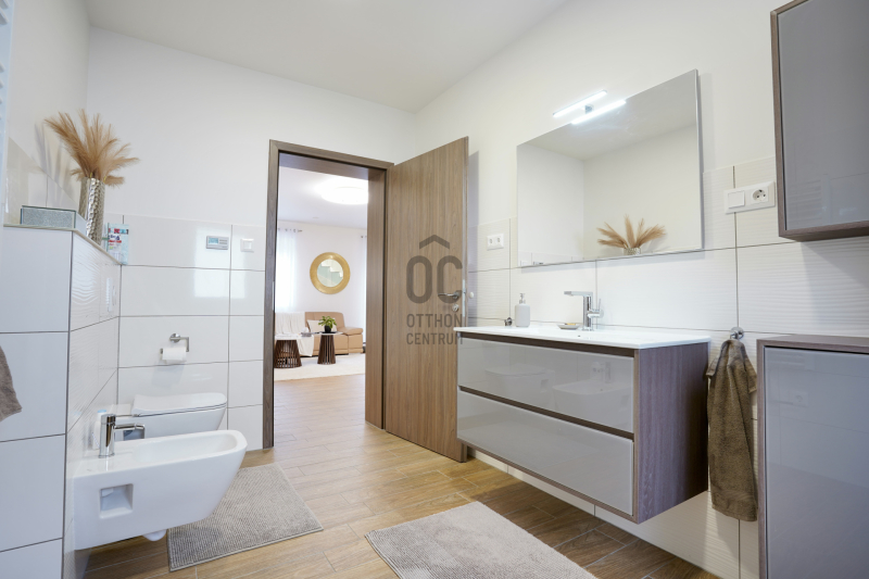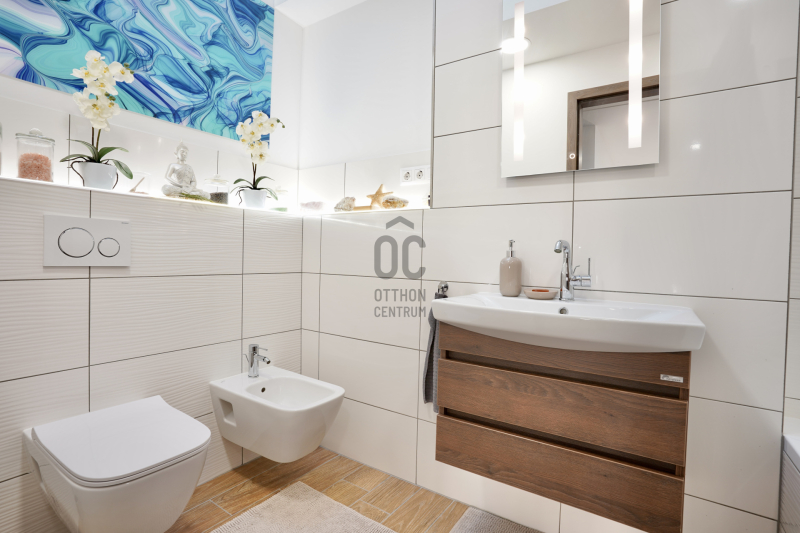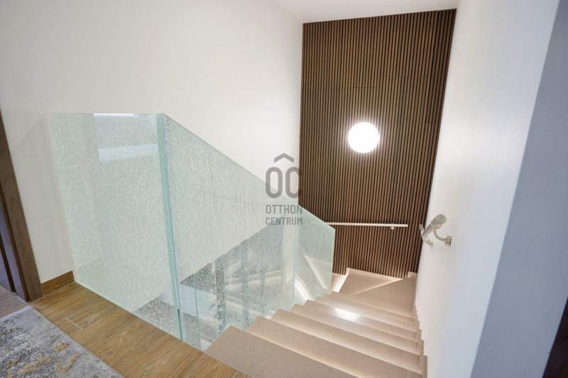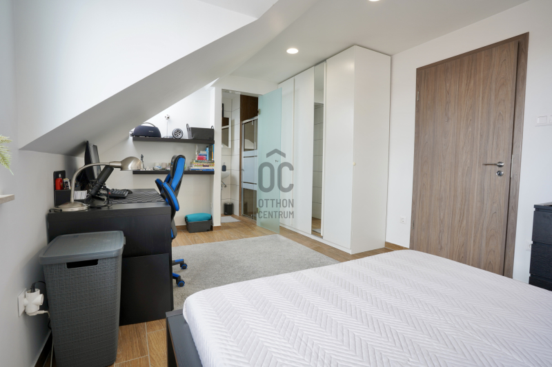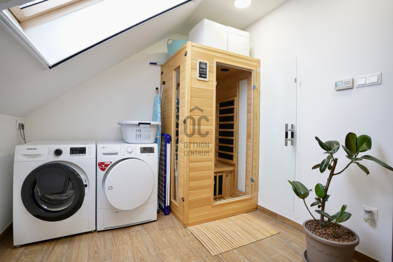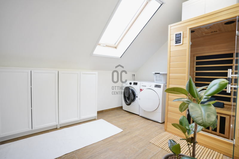 A középső szinten egy hangulatos nappali, egy erkélykapcsolatos hálószoba, valamint egy zuhanyzós fürdőszoba található WC-vel és bidével. A felső szint további két hálószobát kínál, amelyek közül az egyik jelenleg mosókonyhaként funkcionál, itt került kialakításra az infra szauna is, de igény szerint könnyedén visszaalakítható hálószobává. Ezen a szinten egy sarokkádas fürdőszoba is helyet kapott WC-vel és bidével, valamint egy elkülönített lakrész, amely egy hálószobából és egy külön zuhanyzós fürdőszobából áll, így akár vendégek vagy nagyobb család számára is ideális megoldást nyújt.
