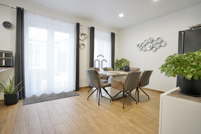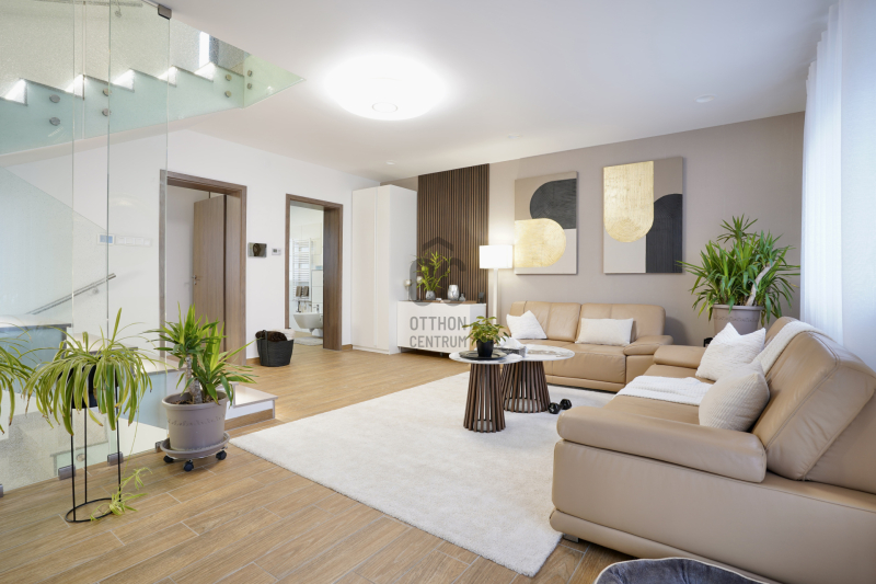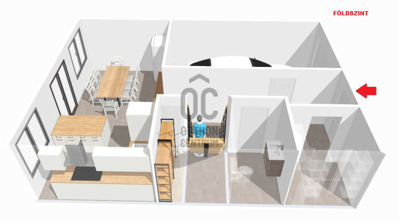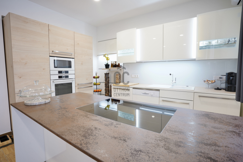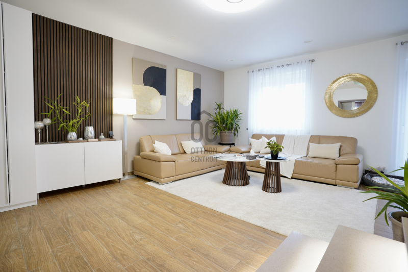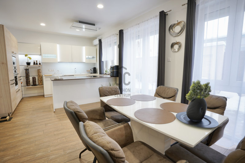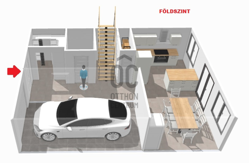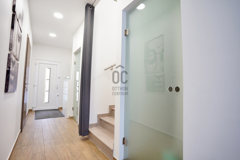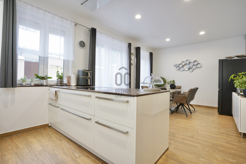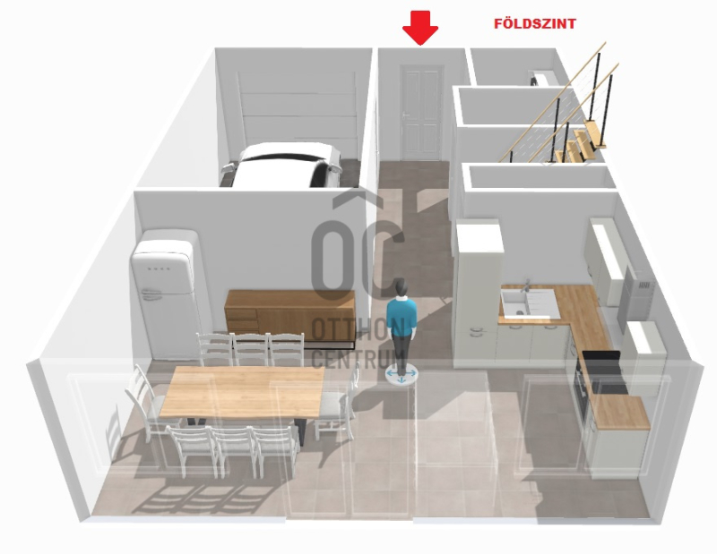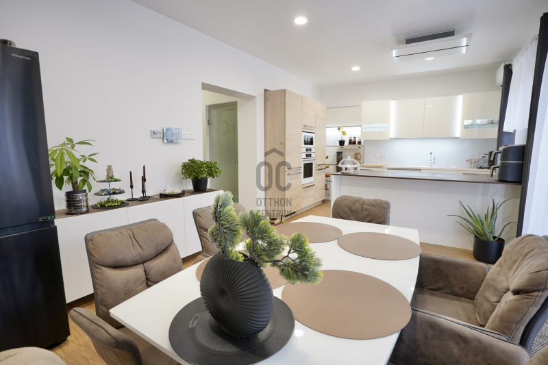 A földszinten található a kényelmes előtér beépített gardróbbal, amely ideális a cipők és kabátok elhelyezésére, innen nyílik az automata garázskapuval ellátott garázs, továbbá egy mosdó és egy kamra is helyet kapott. A tágas konyha–étkező prémium minőségű, beépített konyhagépekkel felszerelt, és közvetlen kijáratot biztosít a teraszra, amely remek helyszíne lehet baráti összejöveteleknek vagy nyugodt pihenésnek.
