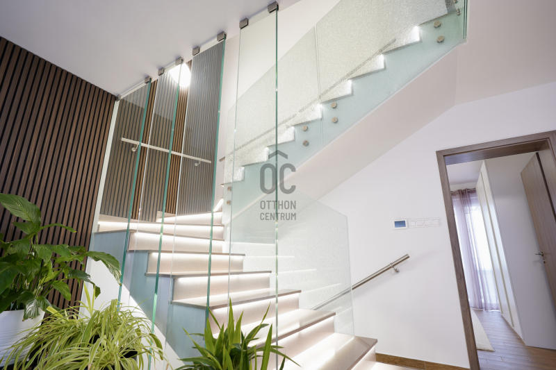 A ház magas műszaki felszereltséggel rendelkezik: háromrétegű, szúnyoghálóval, redőnnyel és árnyékolóval ellátott nyílászárók, szintenként szabályozható hűtő-fűtő klímaberendezések, helyiségenként külön vezérelhető padlófűtés, kondenzációs gázkazán melegvíz-tárolóval, valamint távfelügyeletre kötött riasztórendszer és kamerás kapucsengő szolgálja a kényelmet és a biztonságot. Az elegáns megjelenést gránit lépcsőburkolatok, robbantott üvegű korlátok, valamint beltéri és kültéri hangulatvilágítások teszik teljessé, a belső világítás fényereje pedig igény szerint szabályozható.