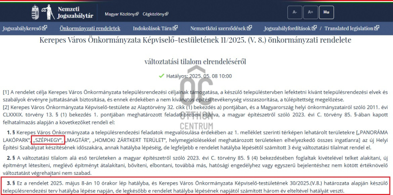 Ezen terület (maga az egész Széphegy) egy önkormányzati döntésnek köszönhetően 2025. május 8-tól maximum 3 évig (2028. május 8-ig) vagy visszavonásig, változtatási (építési) tilalom alatt áll(!), ezért a telek jelen pillanatban inkább befektetési célra ajánlott - mivel az elhelyezkedése és mérete miatt kivételes értéknövekedési potenciállal is rendelkezik – ugyanakkor opcionálisan pedig egy későbbi megvalósításra váró építkezés kiváló alapjául szolgálhat majd!