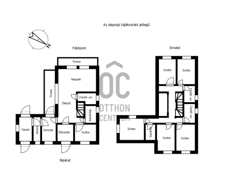 A lakás földszintjén előszoba, konyha, étkező, nappali, egy hálószoba, egy kisebb fürdőszoba, kazánház, kamra és tárolóhelyiségek kaptak helyet. A nappaliból és az étkezőből jutunk a két teraszra, onnan pedig a kizárólagos használati joggal rendelkező, jól szeparált, 542 nm-es parkosított kertbe.