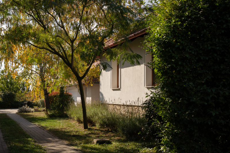 kertkapcsolattal, 24 m²-es napfényes terasszal, fák és örökzöldek által védett, intim telken
