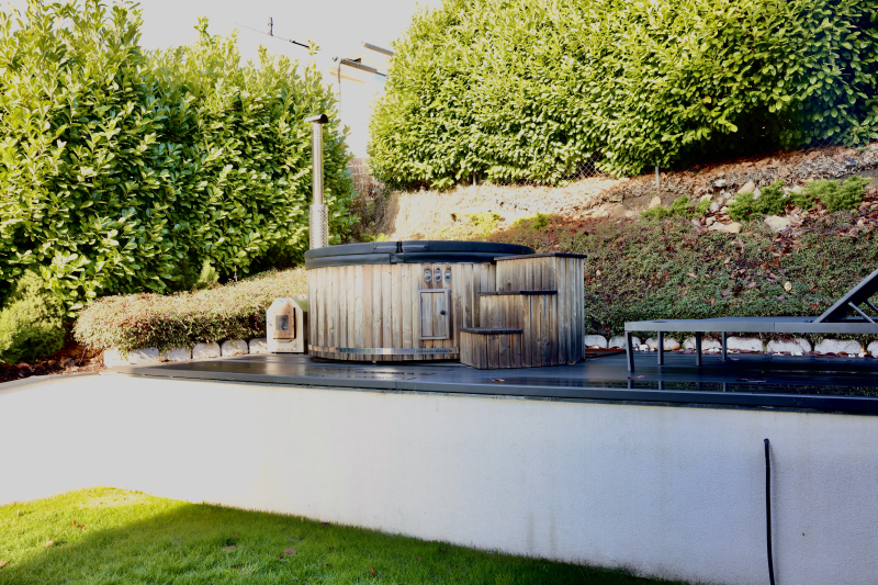 6 személyes, fával fűthető fürdődézsa, mely sókád és jakuzzi egyben, a napozóterasz,