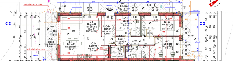 A lakás földszinti, nappali + 3 szobával, külön WC-vel, fürdőszobával, valamint nagyméretű panorámás terasszal rendelkezik.