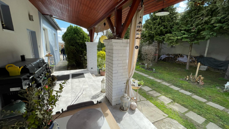 Kertre néző,fedett terasz,parkosított udvar,teljesen körbekerítve!
