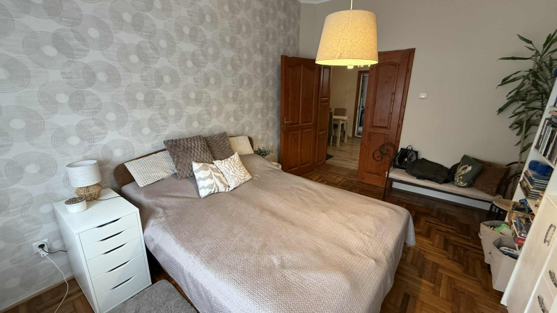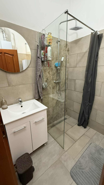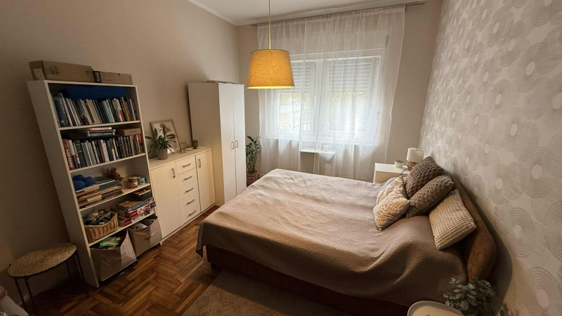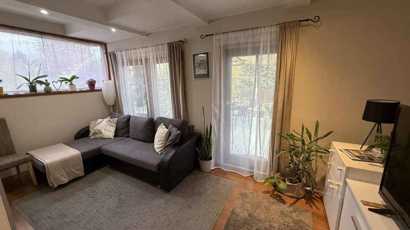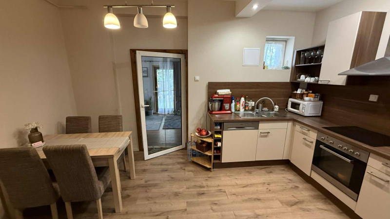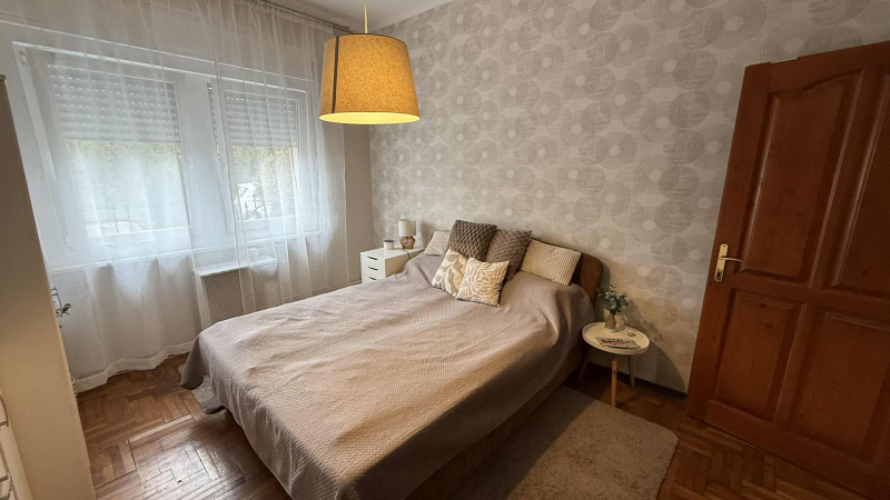 tágas,világos hálószoba,kettő félszoba,fürdőszoba zuhanyzóval,folyosó,gépesített,modern konyha és étkező,valamint egy kertre néző,világos nappali,ahonnan a fedett,hangulatos teraszra érünk.