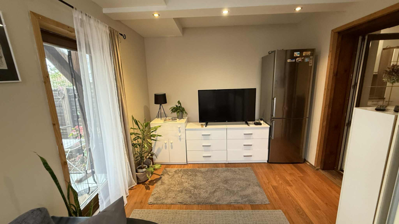 Räumlichkeiten der Immobilie:Geräumiges, helles Schlafzimmer, zwei kleine Schlafzimmer, Badezimmer mit Dusche,Wc,Flur, ausgestattete moderne Küche und Essbereich sowie ein helles Wohnzimmer mit Blick auf den Garten, von dem aus man auf die überdachte, gemütliche Terrasse gelangt.