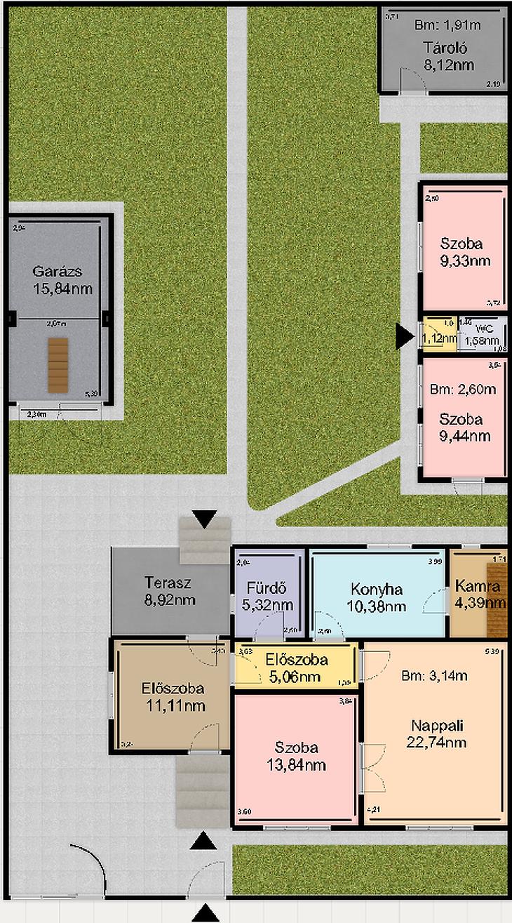 Nettó 77,3nm-es, 2szoba, előszoba, közlekedő, konyha, fürdőszoba + wc helyiségekből áll, illetve az előszobából nyílik egy 8,92nm-es TERASZ is. A ház alatt található egy kb. 10nm-es pince, ami a kamrából közelíthető meg, a padlásfeljáró is itt található. Tetőtere beépíthető, mivel beton födémes, a tető váza pedig vas szerkezetű, zsindely borítással.