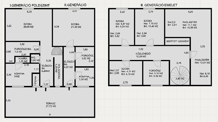 Az I. generáció: belső két szintes 113 m2. A földszinti részen előszoba, dolgozószoba, szoba konyha, fürdőszoba, kamra, közlekedő és mellékhelyiség található. Az emeleten 3 félszoba, közlekedő, fürdőszoba és egy bővíthető padlástér (1-2 szoba még kialakítható) áll rendelkezésre.