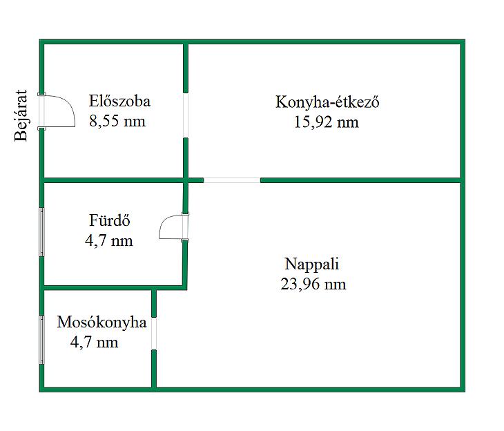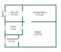 Elosztás: előszoba, konyha–étkező, nappali, zuhanyzós fürdő-WC, mosókonyha.