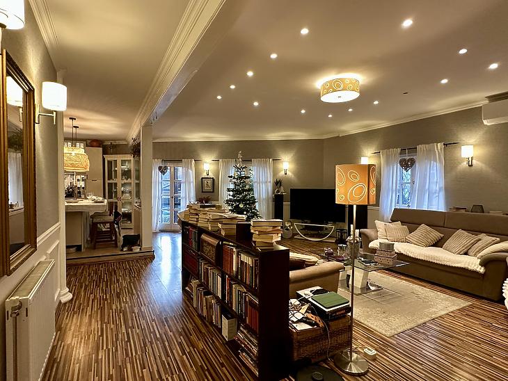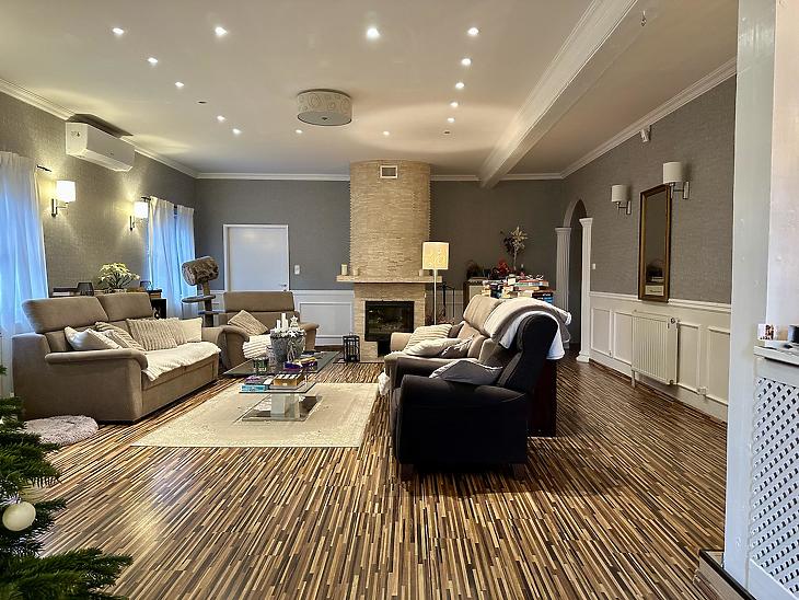 A szobák laminált parkettával, a többi helyiség járólappal vannak burkolva, a nyílászárók fa típusú termo üvegesek, a nappali és az egyik hálószoba klímával felszerelt.