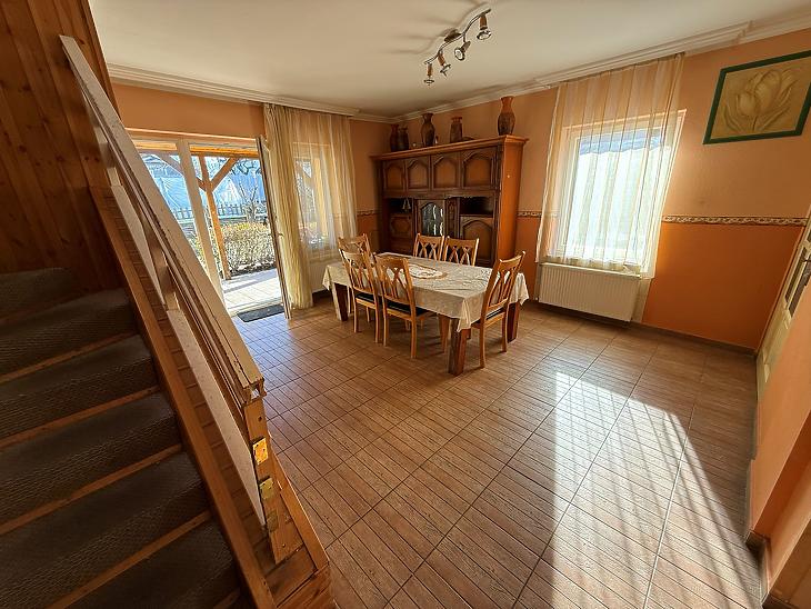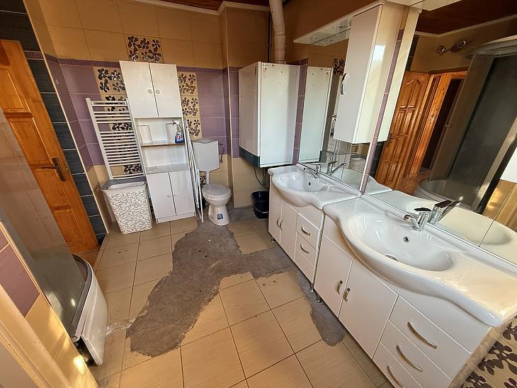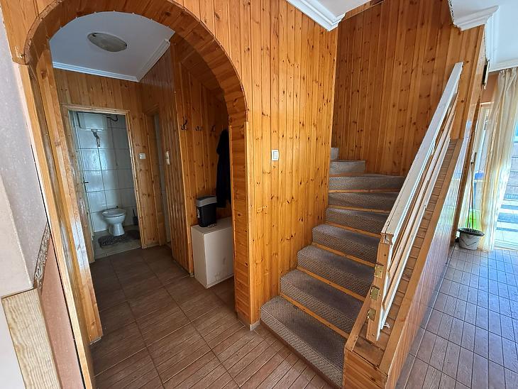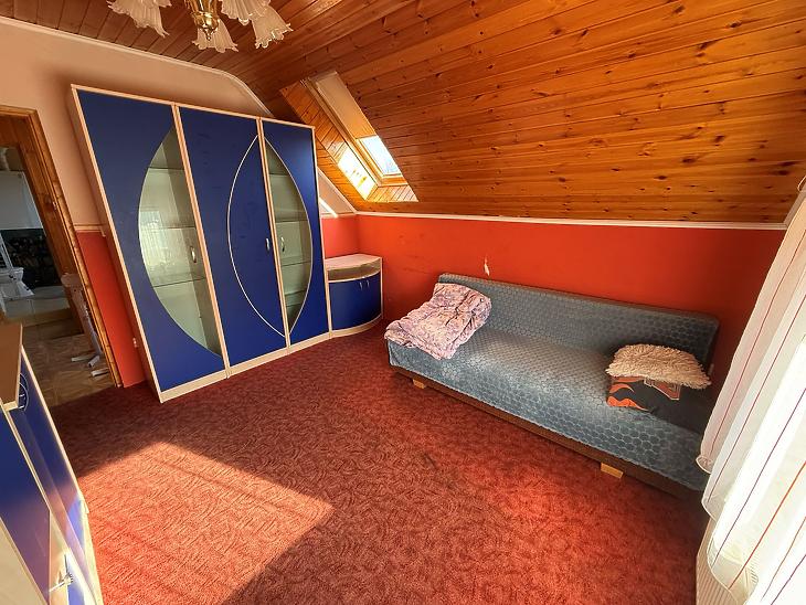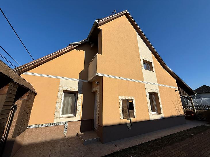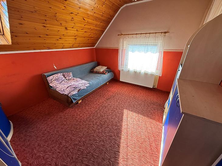 Emelet: 3 szoba, zuhanyzós fürdőszoba + mellékhelyiség, közlekedő, erkély.