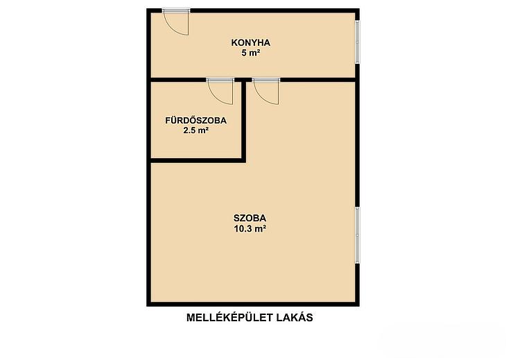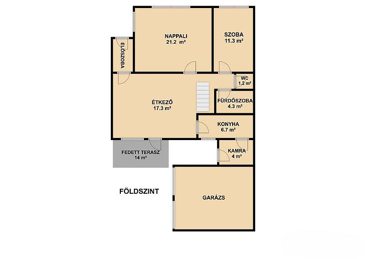 Földszint: nappali, szoba, konyha, étkező, zuhanyzós fürdőszoba, mellékhelyiség, közlekedő, előszoba, kamra, 14 négyzetméteres terasz.