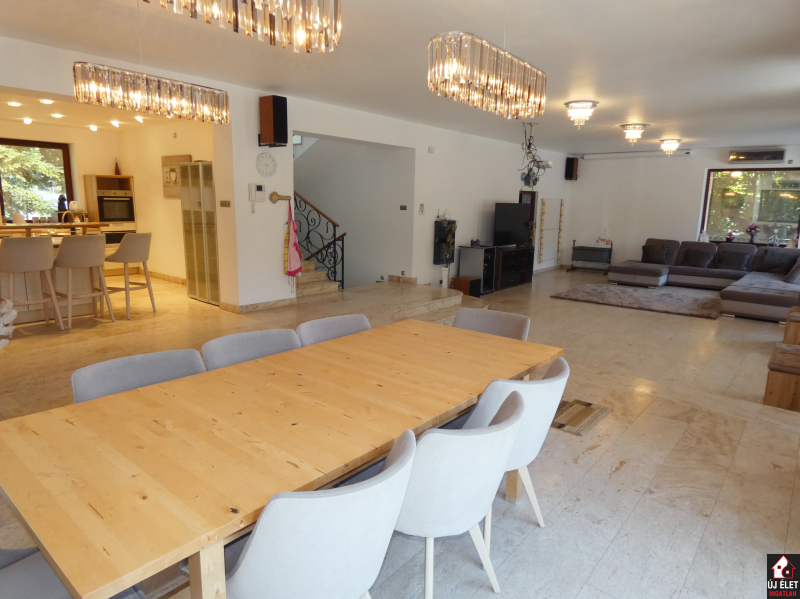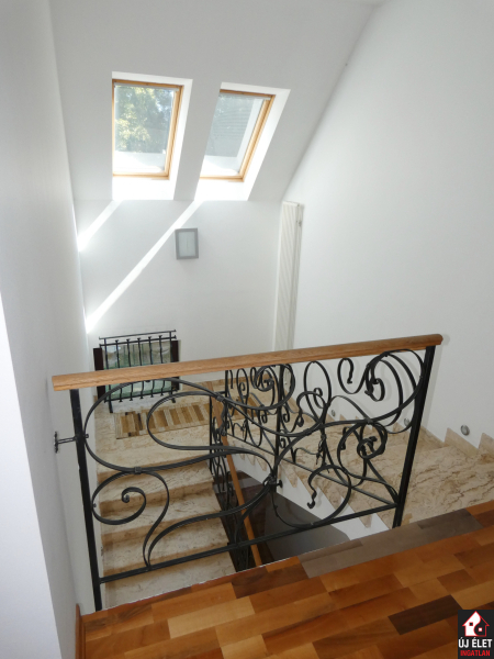 Már az is lélegzetelállító, amikor a telekre belépünk. Hiszen a ház nagyságrendileg a hatalmas telek közepére épült, így amikor behajtunk a masszív, terméskő oszlopok között valódi kovácsoltvas elemekkel díszített kerítés, kétszárnyú elektromos KOVÁCSOLTVAS KAPU-ján keresztül, akkor kb. 1.000 m2-nyi ŐSFÁS, GONDOZOTT PARK tárul a szemünk elé, és emögött bújik meg diszkréten a pazar épület.
