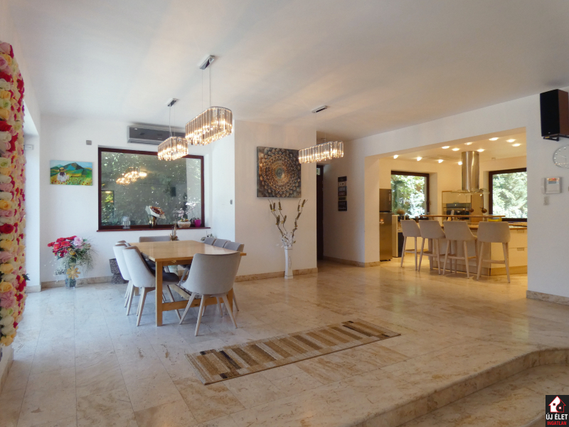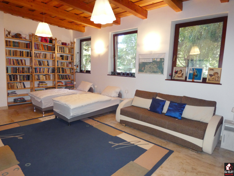 Az egész földszint, a fa gerendákkal díszített dolgozó szobával, illetve a lépcsőházzal együtt CSISZOLT ÉDESVÍZI MÉSZKŐ burkolatot kapott (travertin).