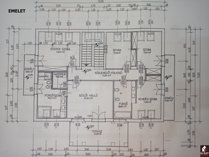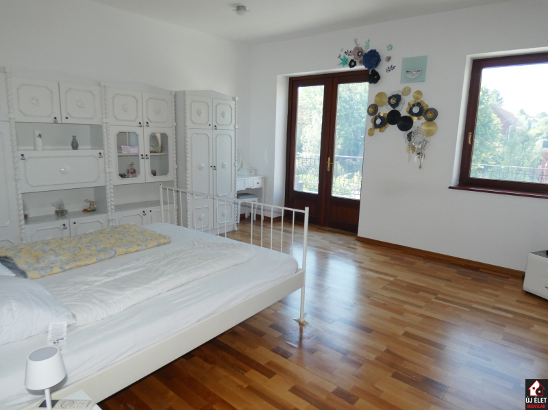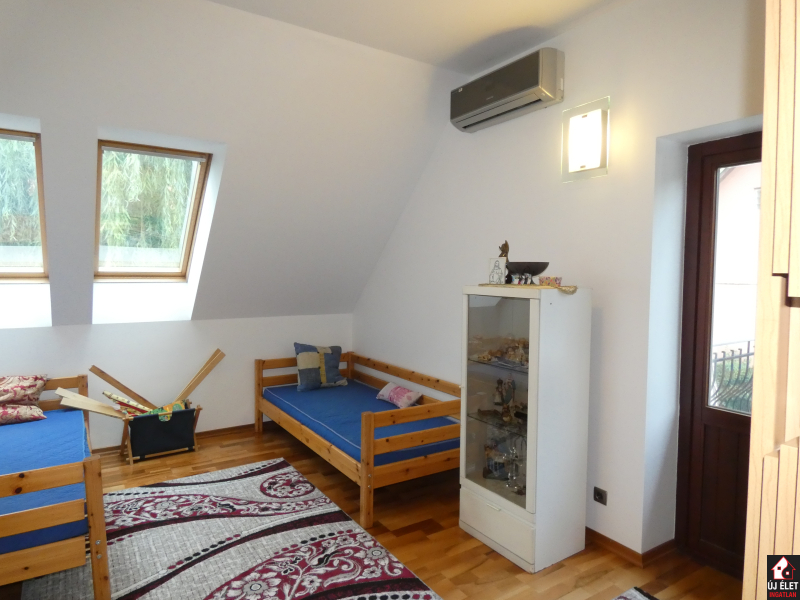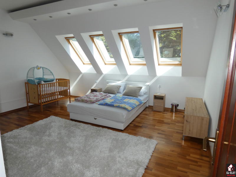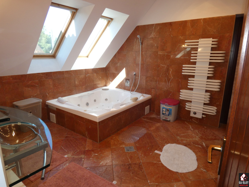 Az EMELETEN, a tetőtérben (belmagasság: 2,85 m) - a kontyolt nyeregtető alatt - találunk egy 25 m2-es szülői hálószobát saját fürdővel, saját gardróbbal és saját terasszal (21 m2). Ezen túl még 4 szoba (21 m2, 15 m2, 13 m2, 13 m2) hatalmas beépített szekrényekkel, és egy másik fürdőszoba is helyet kapott az emeleten, illetve még két nagyobb erkély (6 illetve 10 m2). A szülői hálóhoz tartozó fürdőszobában egy dupla férőhelyes jakuzzis fürdőkád van beépítve a tetőtéri ablakok alá, hogy este a csillagokban is gyönyörködhessen, és egy hidromasszázs zuhanykabin, dupla mosdó, wc, és bidé is található itt.