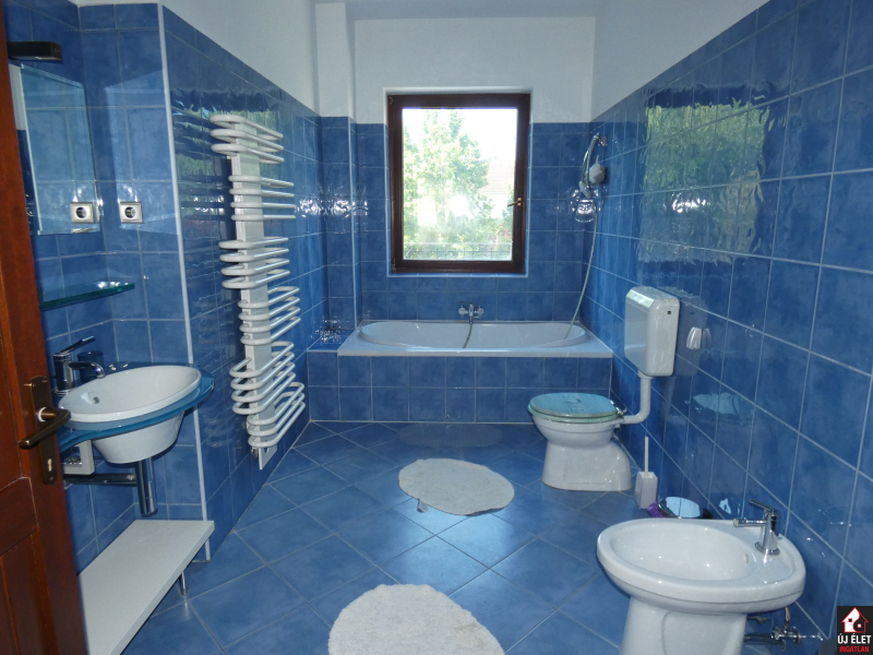 A folyosóról nyíló fürdőszoba kádas, szintén dupla mosdós, és wc és bidé is helyet kapott.