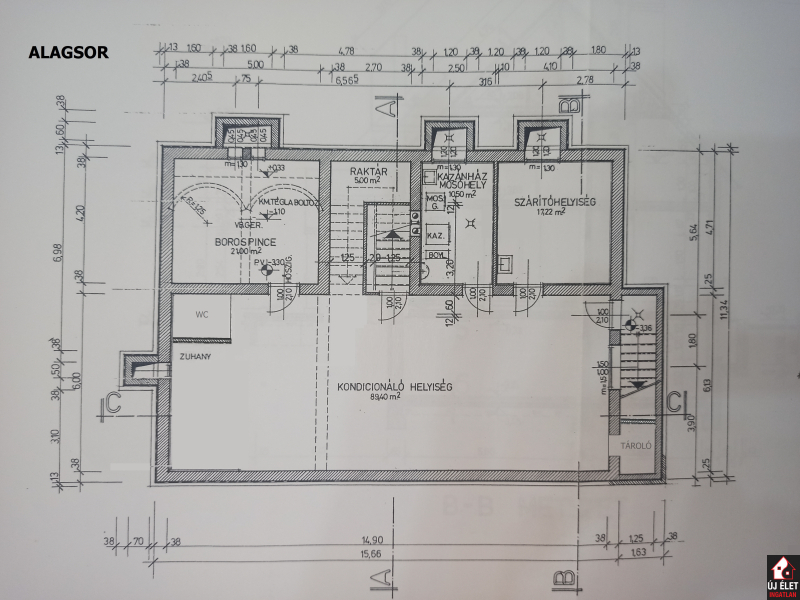 Az ALAGSORI SZINTEN (belmagasság: 2,82 m) egy 90 m2-es egylégterű fitness és hobbi helyiségben a kondi gépek, a szauna a hozzátartozó zuhanyzóval, és a biliárdasztal kapott helyet. Ezen a szinten található a gépház a mosókonyhával egyben, egy tágas szárító helyiség, egy kis tároló és a BOROSPINCE is.