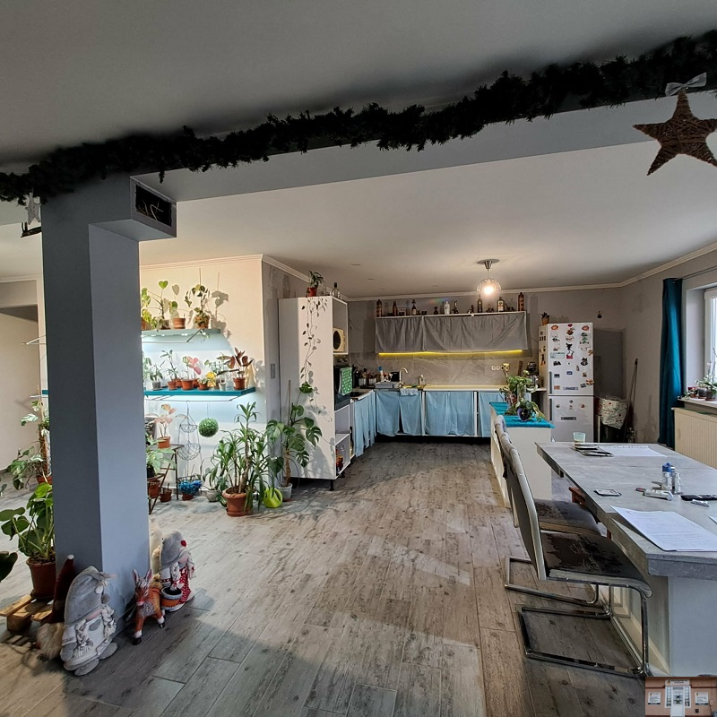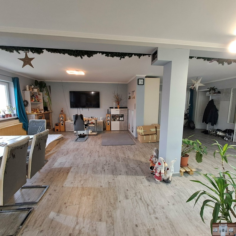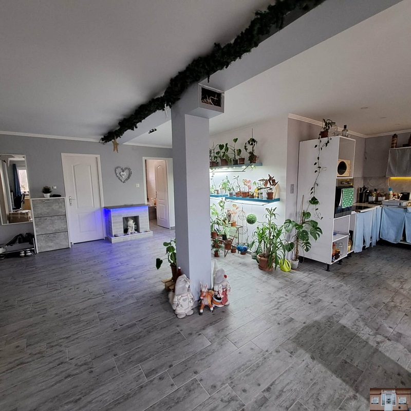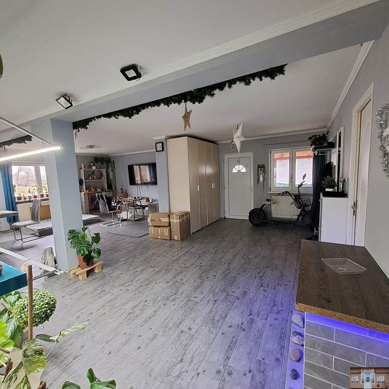 Az ingatlan lakóterülete 97,4 m2, melyben nappali, 3 félszoba, fürdőszoba (kád és zuhanyzó is ki van építve), közlekedő, valamint WC található. A házhoz „L” alakú kb. 60 m2-es fedett terasz is tartozik. A tetőtér 70 m2, mely csak betonozva van.