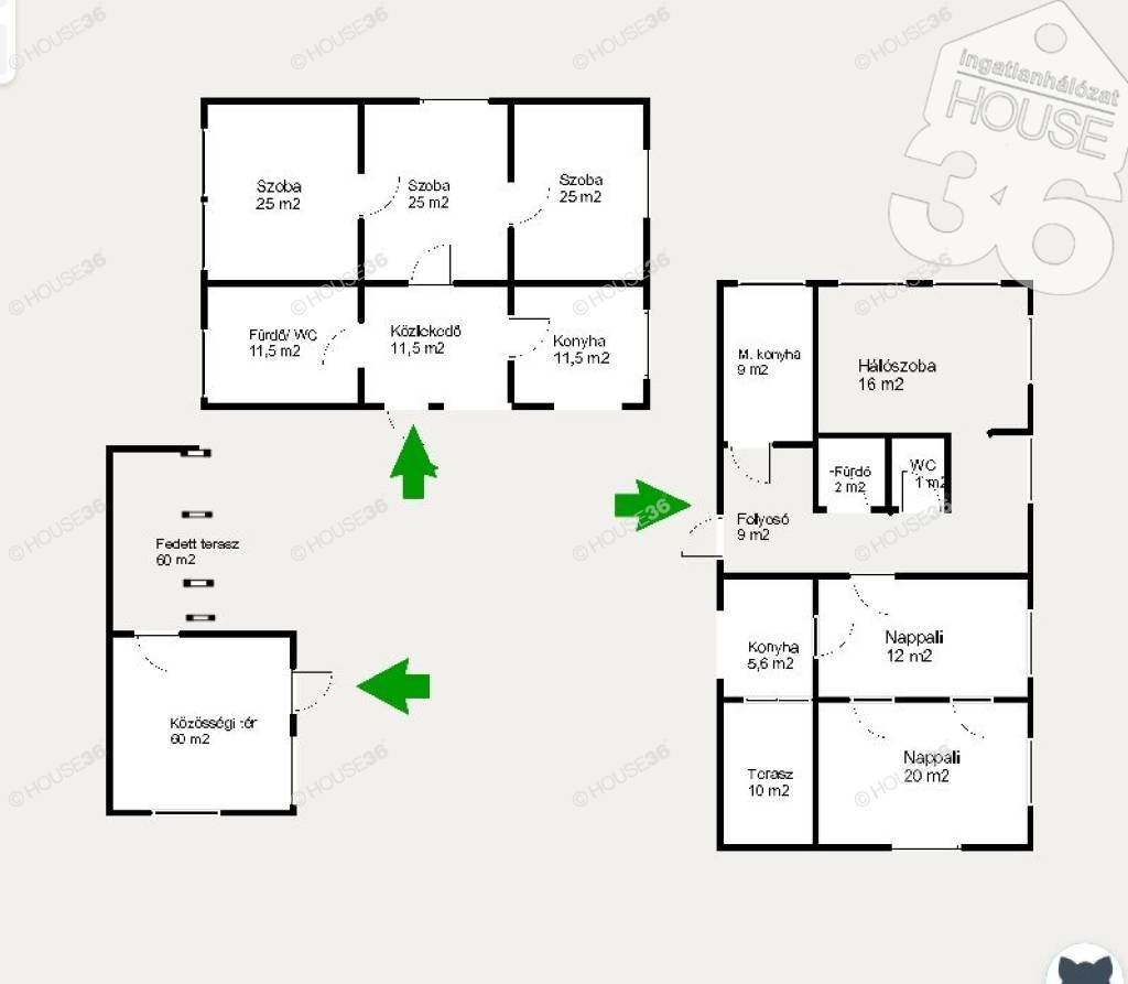 Két ház, 135 m2 és 90 m2, egy hűtött- fűtött közösségi tér 60 m2, fedett terasszal ami szintén 60 m2.