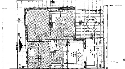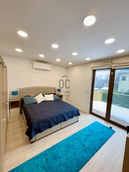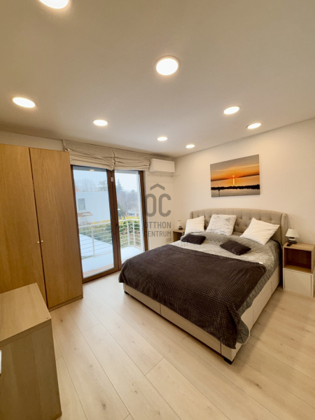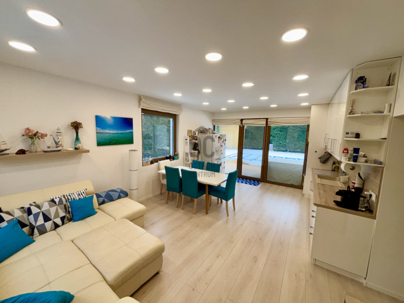 A modern ház belsejében, a földszinten tágas, világos amerikai konyhás nappali, közvetlen kijárattal a teraszra és a kertbe, 1 hálószoba, előszoba, háztartási helyiség, fürdőszoba wc-vel