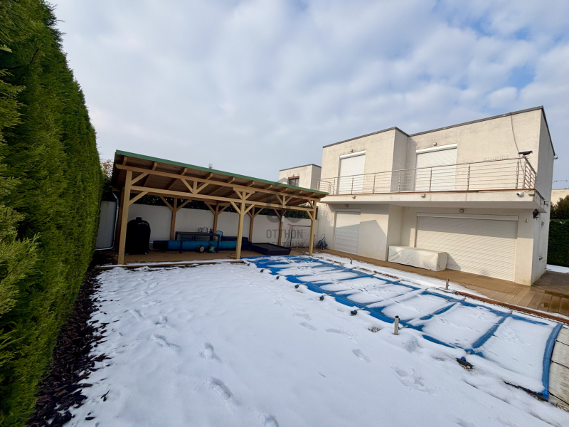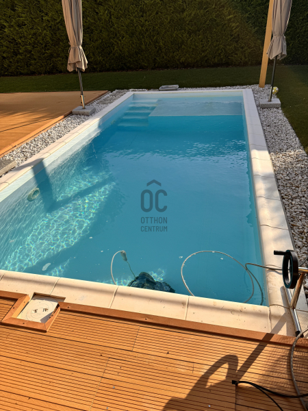 A telek 400 m2, míg a ház 140 m2, kiegészítve 50 m2 terasszal, medencével és külső tárolóval.