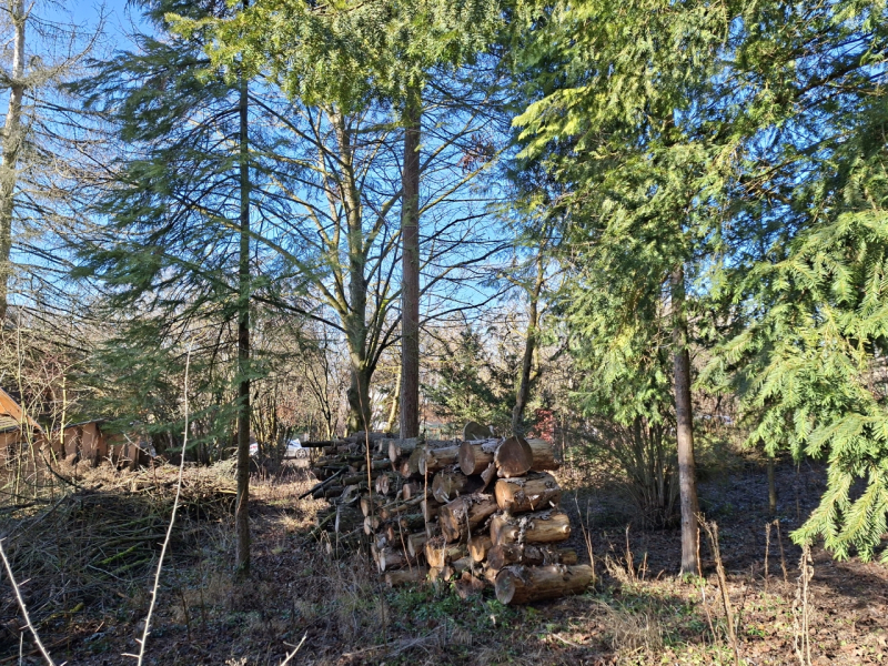 A telek zöld, a növényzet természetes, valamint van rajta egy barátságos kis ház, tárolóval.