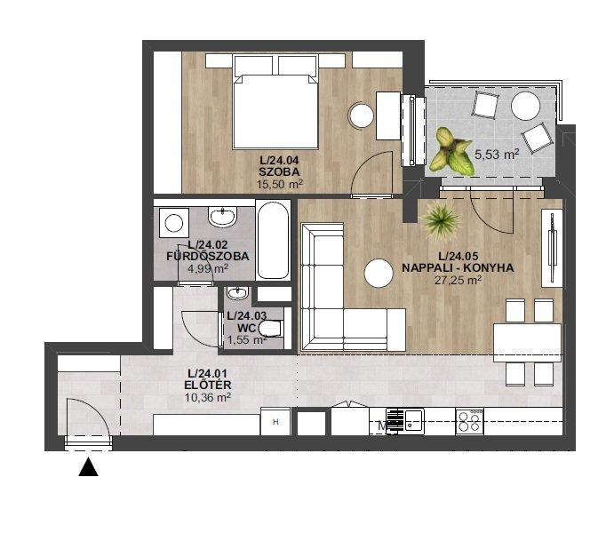 Hirdetésben szereplő otthon 59,65 nm alapterületű, melyhez 5,53 nm terasz tartozik, 3. emeleten található és déli tájolású. Nappali, konyha-étkezőhöz 1 külön nyíló szoba tartozik. Részletes helyiség lista és elrendezése az alaprajzon megtekinthető.