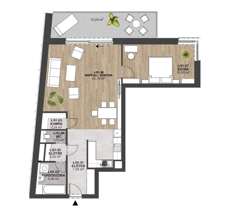 - lakások alapterülete 39nm-120nm közötti, melyek legtöbbjeihez különböző méretű terasz tartozik