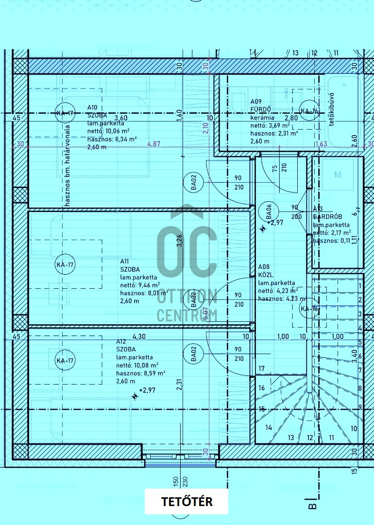 A tetőtérben két háló, fürdő,+WC, és egy gardrób található.
