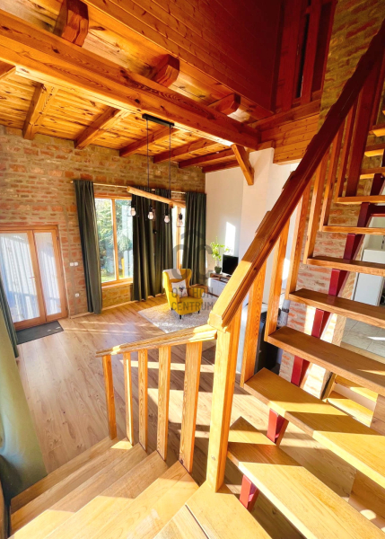 A sok természetes, fa anyag felhasználásából adódóan az ingatlan teljesen beleillik a környezetbe. Itt a természet és az ember végtelen harmóniában élhet egy csendes, nyugodt helyen, közvetlen az erdő és annak sokszínű élővilága mellett.