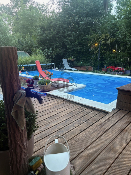 A medencés családi ház lehetőséget ad a nyári hűsölésre, a baráti összejövetelekre vagy egyszerűen csak a pihenésre a zöld otthon nyugalmában.
