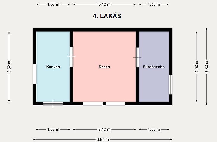 Lakrészenként kb. 60 NM, jelenleg mind ki van adva, a villany és a víz mind külön mérőórán van, a gáz egy óráról működik.