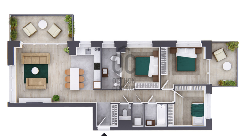 A lakás két terasszal rendelkezik: az egyik a nappaliból, a másik az egyik hálószobából nyílik, ideális teret biztosítva pihenéshez és elvonuláshoz.