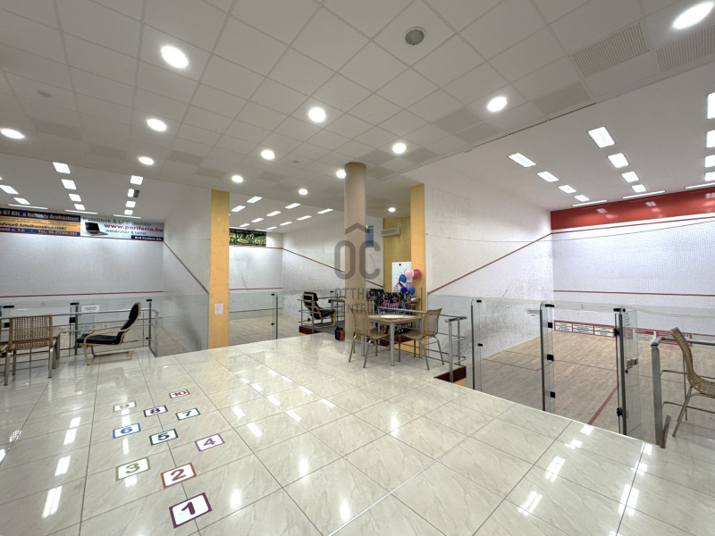 - Öltözők, mosdók, szauna, személyzeti és raktár helyiség, illetve külön gépészet is ki lett alakítva az egy légterű hatalmas közösségi tér és 3 squash pálya mellett.