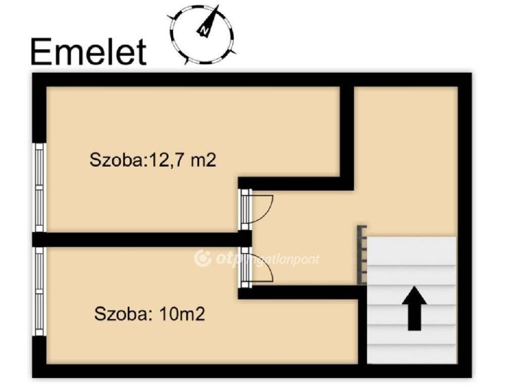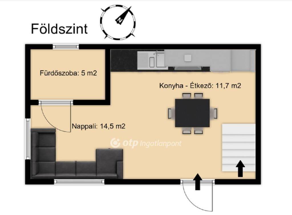 A földszinten amerikai konyhás nappali, valamint fürdőszoba WC-vel kapott helyet, az emeleten pedig két külön nyíló szoba található. Mindkét szinten beépített szekrények segítik a praktikus tárolást, a konyhában pedig egy külön kamraszekrény növeli a mindennapi kényelmet.