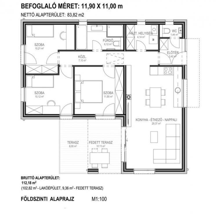 A ház bruttó 114,13 nm beépített területtel és nettó 83,82 nm hasznos alapterülettel rendelkezik, nappali + 3 szobás kialakítással.