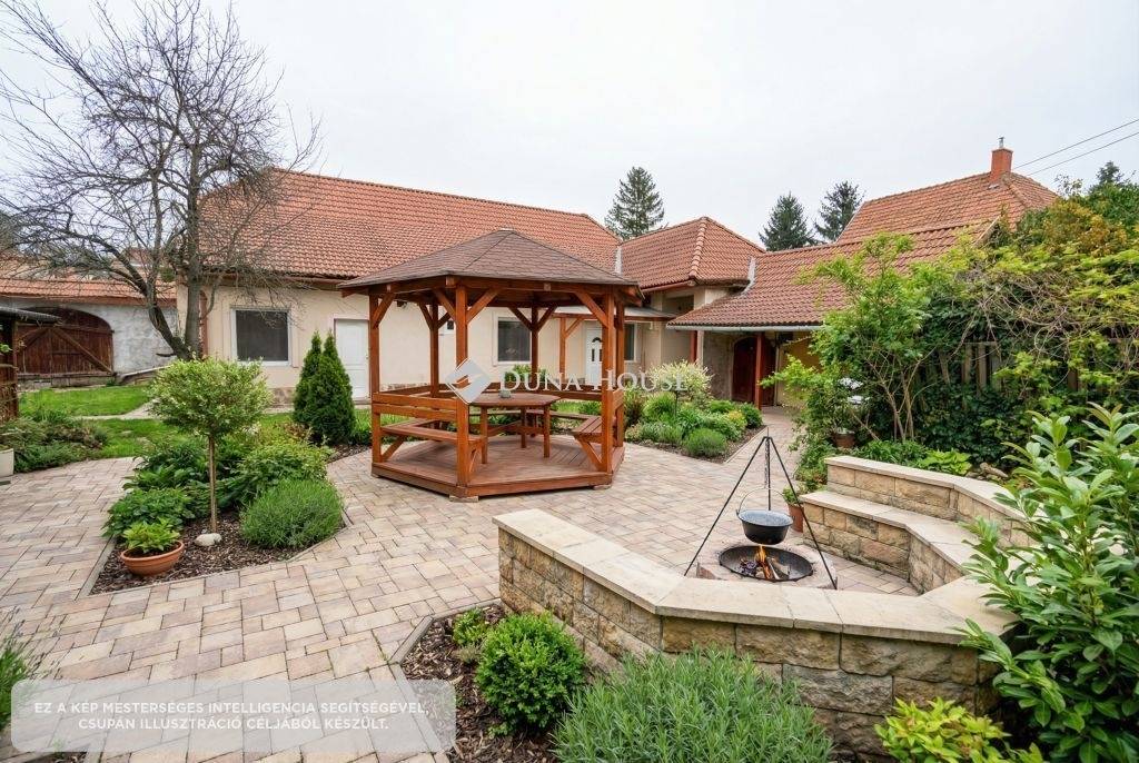 A 562 m²-es telek valódi pluszt ad: nagy udvar fedett terasz ahol már megkezdődött egy kemence kialakítása (AI kép), kültéri wellness, szauna kialakítására alkalmas épületrész (AI kép), pince, garázs (25 m²), több autó számára is kialakítható beállási lehetőség